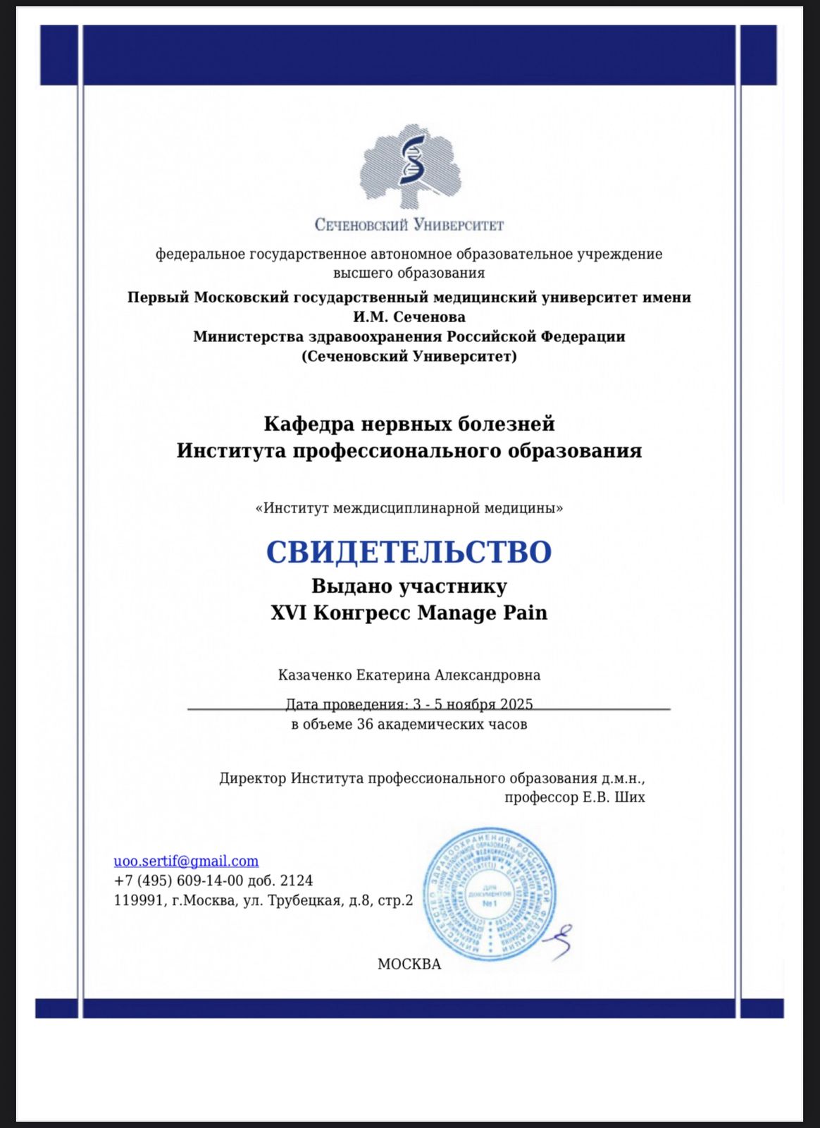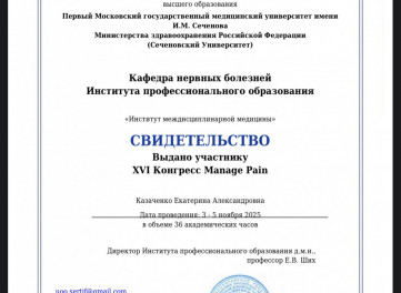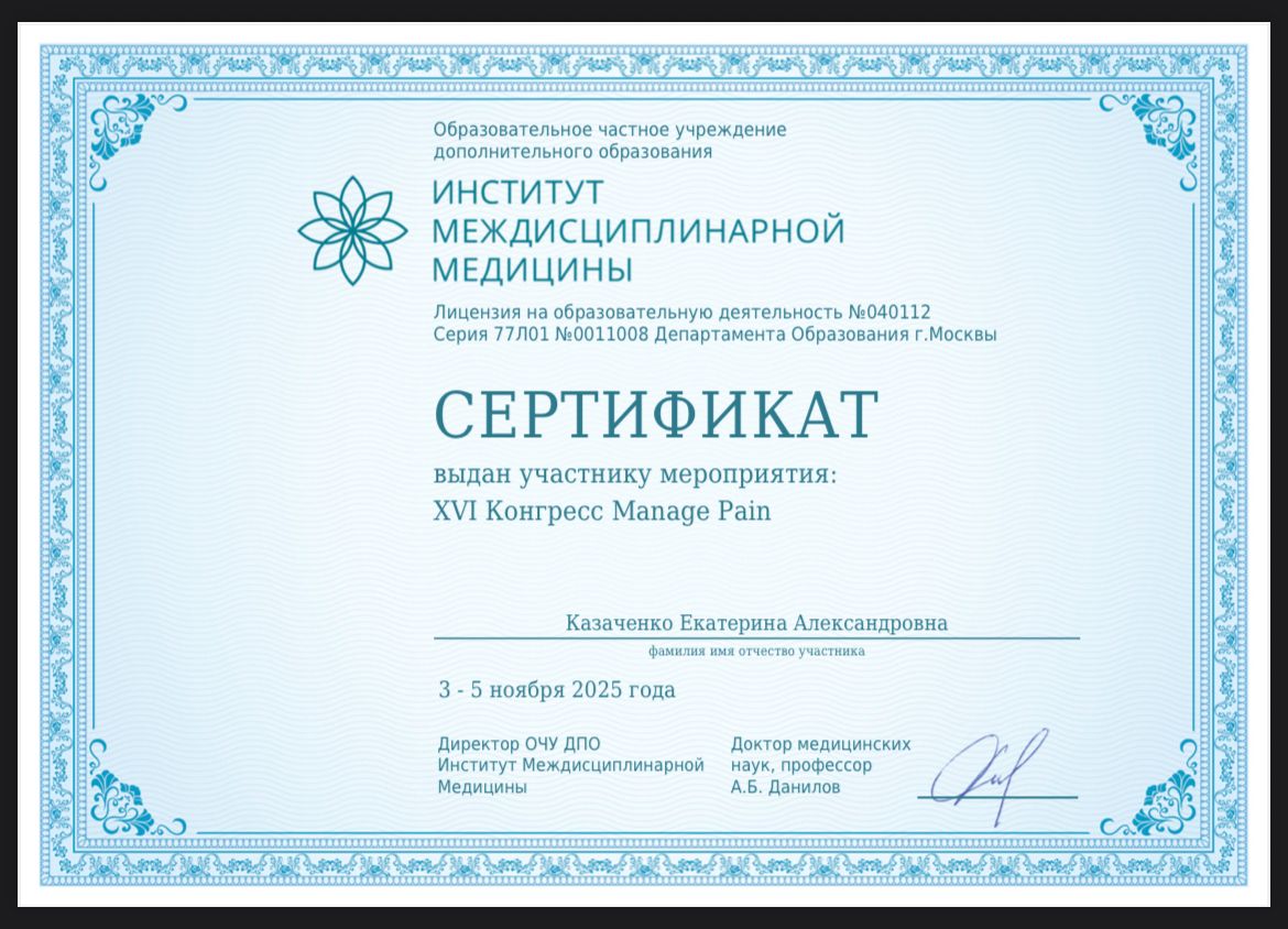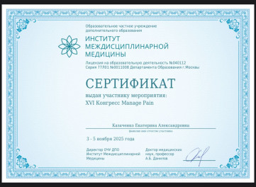 - 2025 г. - Институт междисциплинарной медицины, участник XVI Конгресса Manage Pain, 36 академических часов;