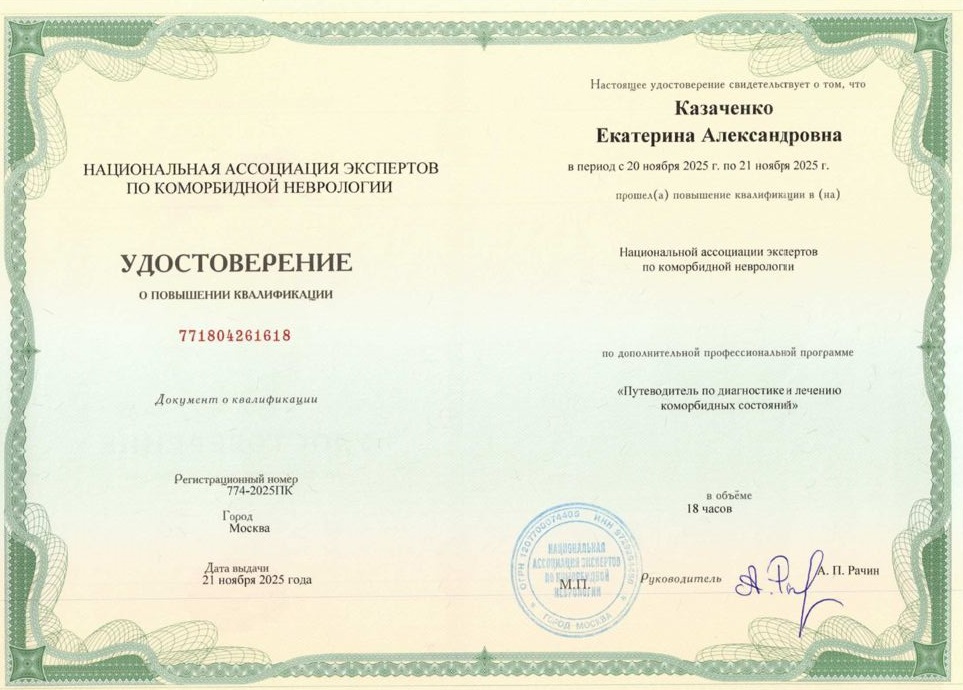- 2025 г. - Повышение квалификации по дополнительной профессиональной программе "Путеводитель по диагностике и лечению коморбидных состояний";