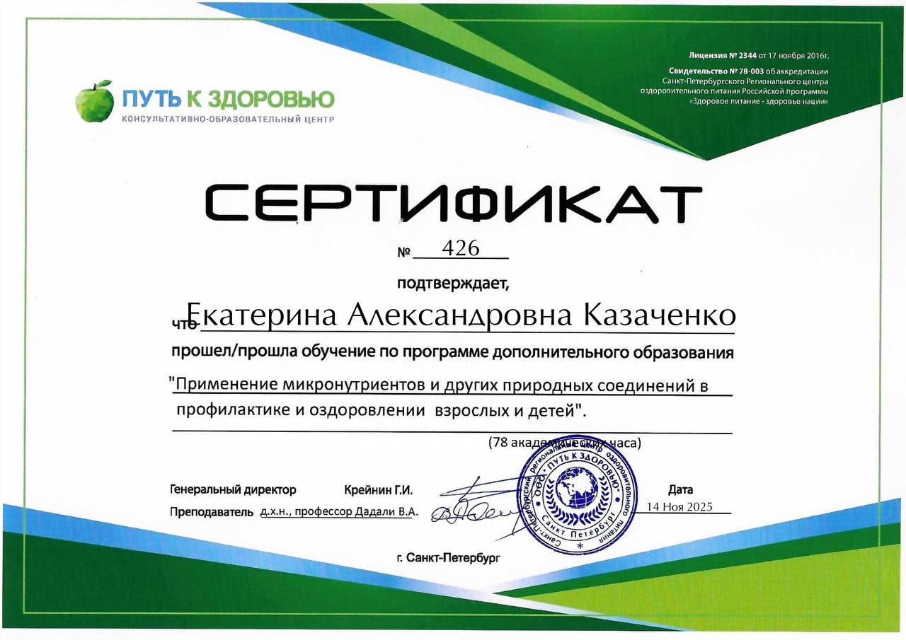 - 2025 г. - Программа дополнительного образования "Применение микронутриентов и других природных соединений в профилактике и оздоровлении взрослых и детей";